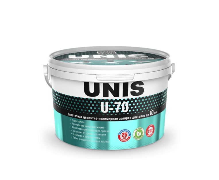 Цементно-полимерная армированная затирка для швов UNIS U-70 Применяется для плиточных швов в местах со средними и повышенными нагрузками при эксплуатации.